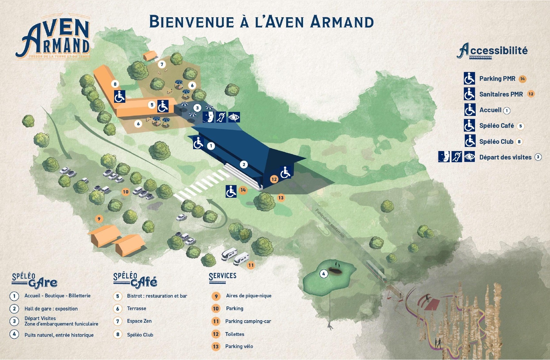 Le site de l’Aven Armand est accessible PMR. Le parking dispose de places PMR. L’accueil, la boutique, le Spéléo Café et les toilettes sont accessibles.